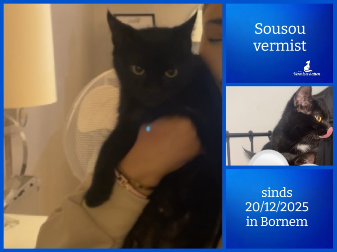 Naam kat: Sousou Datum vermist: 20/12/2025 Plaats verdwijning: Allemanshofstraat Woonplaats: Bornem Provincie: Antwerpen Geslacht: Kattin Gesteriliseerd/Gecastreerd: Nee Geboortedatum Kat: 3 jaar Chip: Ja Aanvullende kenmerken: Ze is hele maal zwart enkel aan de hals...