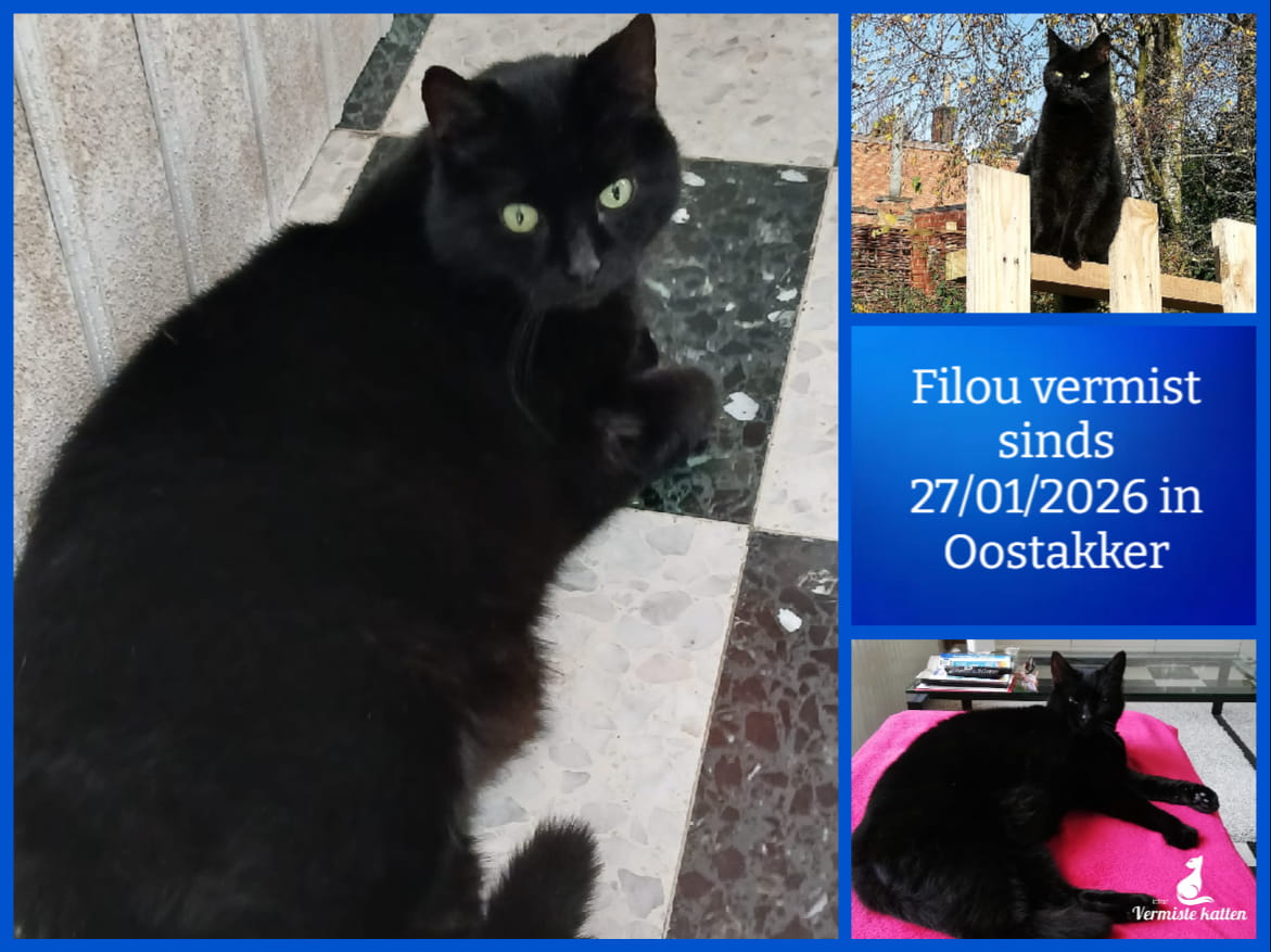 Naam kat: Filou Datum vermist: 27/01/2026 Plaats verdwijning: Achtenkouterstraat Woonplaats: 9041 Oostakker Provincie: Oost-Vlaanderen Geslacht: Kater Gesteriliseerd/Gecastreerd: Ja Geboortedatum Kat: 10 jaar Chip: Nee Aanvullende kenmerken: Grote volledig zwarte kater. Schuchter. Vrij grote hoektanden Mail: vermistekatten.be@gmail.com...