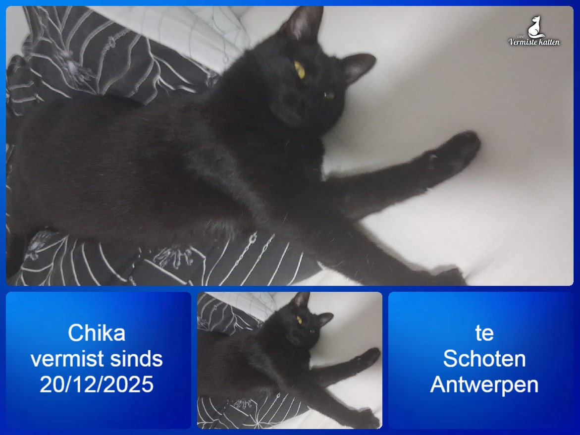 Naam kat: Chika Datum vermist: 20/12/2025 Plaats verdwijning: Pletterlijstraat Woonplaats: Schoten Provincie: Antwerpen Geslacht: Kattin Gesteriliseerd/Gecastreerd: Ja Geboortedatum Kat: Ze is 5 jaar oud Chip: Ja Aanvullende kenmerken: Zij is volledig zwart en heeft...