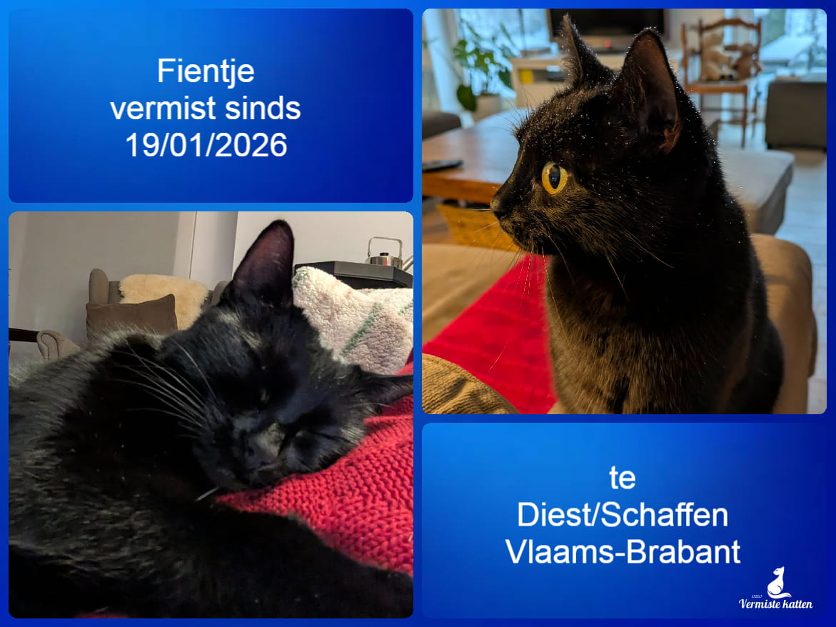 Naam kat: Fientje Datum vermist: 19/01/2026 Plaats verdwijning: Barenbergsweg Woonplaats: Diest/ Schaffen Provincie: Vlaams-Brabant Geslacht: Kattin Gesteriliseerd/Gecastreerd: Ja Geboortedatum Kat: 01/07/2021 Chip: Ja Aanvullende kenmerken: zwart, klein katje Mail: vermistekatten.be@gmail.com...