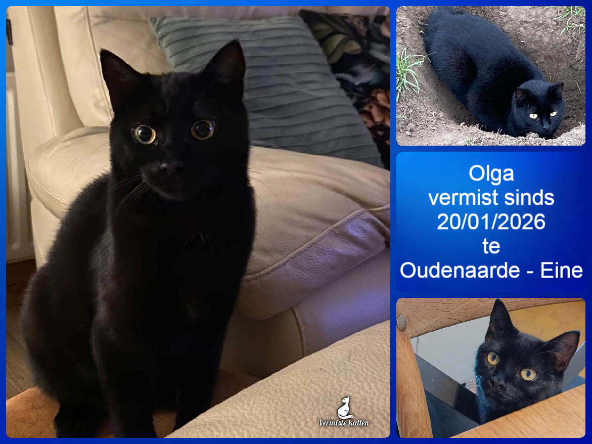 Naam kat: Olga Datum vermist: 20/01/2026 Plaats verdwijning: Akkerstraat Woonplaats: Oudenaarde - Eine Provincie: Oost-Vlaanderen Geslacht: Kattin Gesteriliseerd/Gecastreerd: Ja Geboortedatum Kat: 01/07/2024 Chip: Ja Aanvullende kenmerken: Lief. Sociaal. Nieuwsgierig Mail: vermistekatten.be@gmail.com...