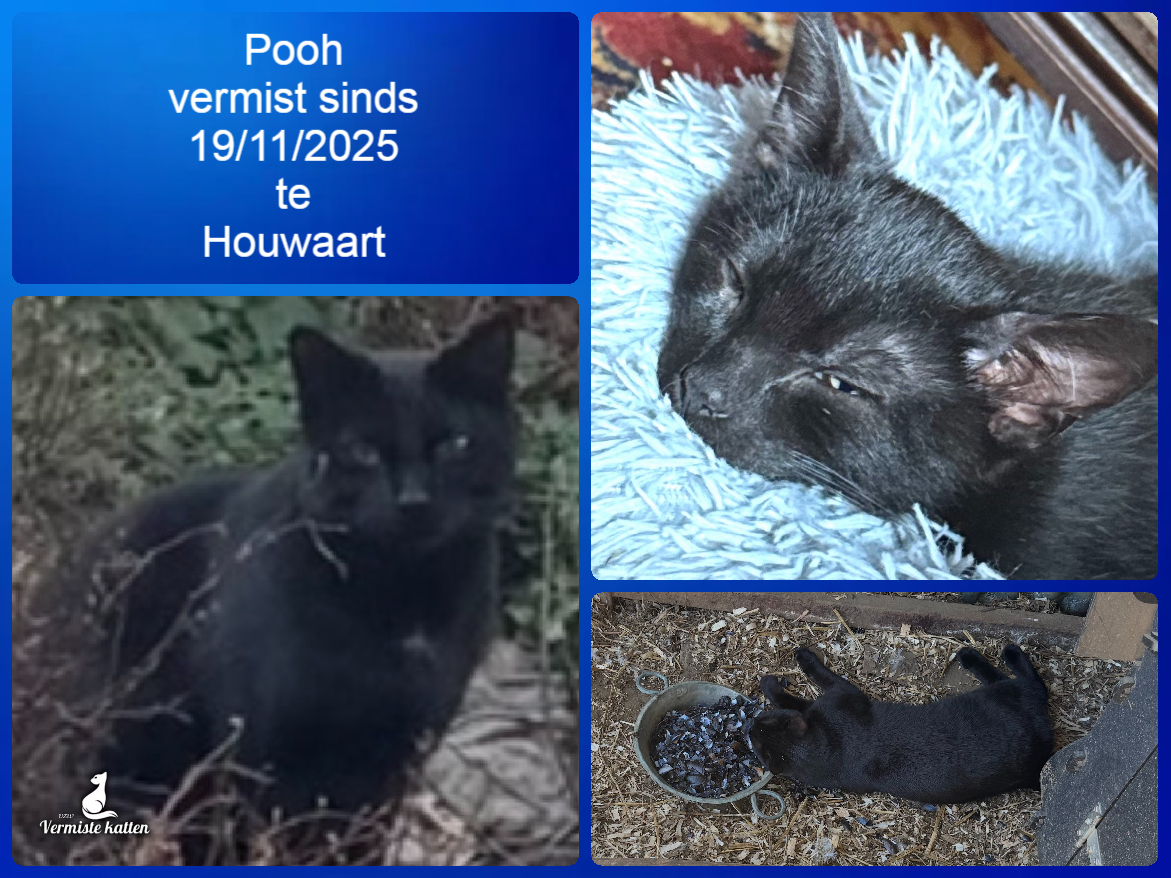 Naam kat: Pooh Datum vermist: 19/11/2025 Plaats verdwijning: Kriebekestraat Woonplaats: Houwaart Provincie: Vlaams-Brabant Geslacht: Kater Gesteriliseerd/Gecastreerd: Ja Geboortedatum Kat: 16/05/2024 Chip: Ja Aanvullende kenmerken: Zwarte kat met bruine schijn heeft enkele witte haartjes op...